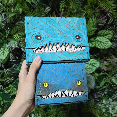 A sharp-toothed little terror from the Monster Library, The Biter snaps shut to guard whatever treasures you dare place inside. Smaller than The Nibbler but just as hungry, this compact monster book is a fully functional storage piece — perfect for cards, dice, or small notebooks that need protecting from wandering hands.