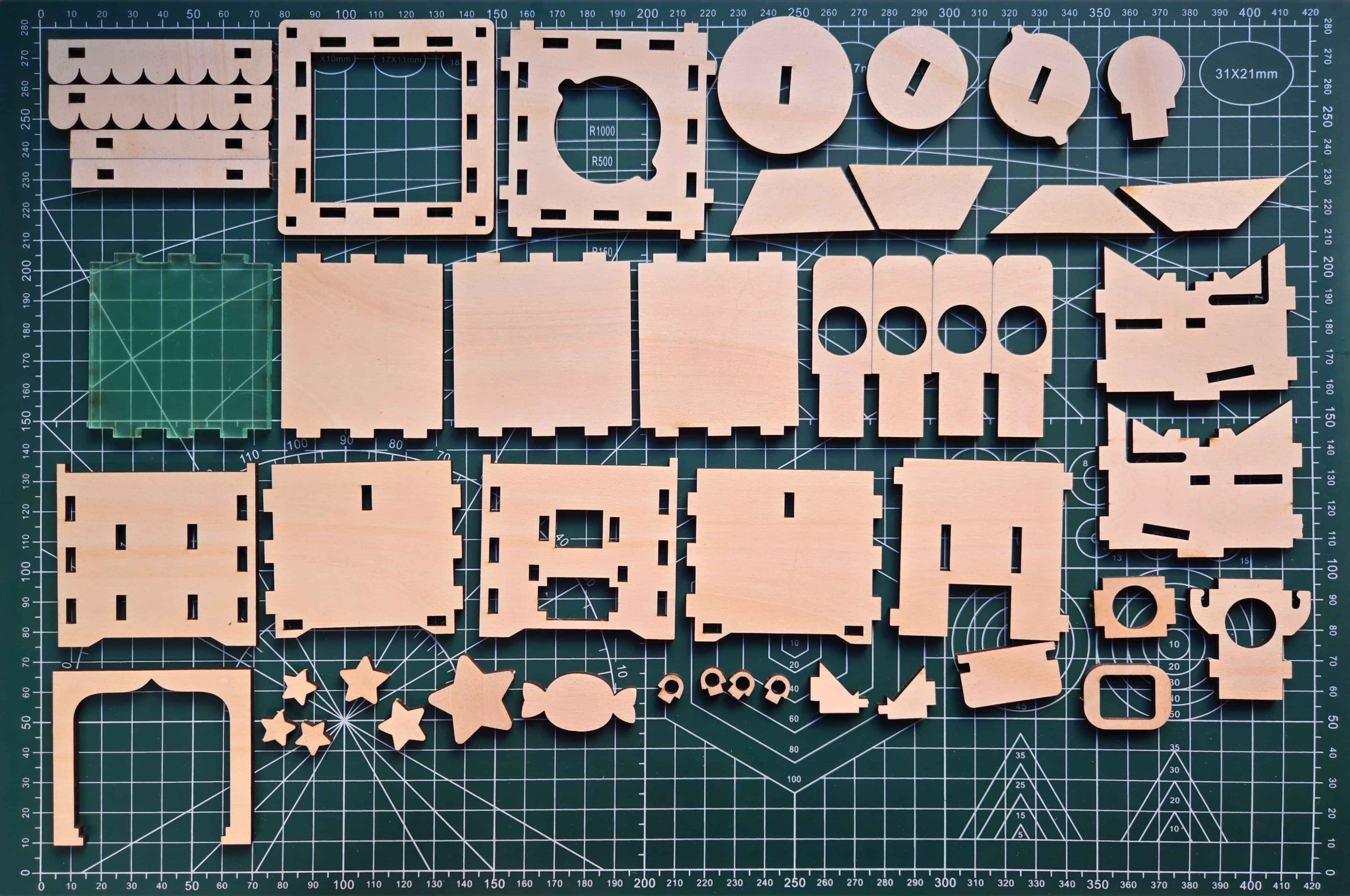 Pre-cut wooden parts that fit together with satisfying precision (we use a laser cutter—think of it like a super-powered craft knife 🔥)